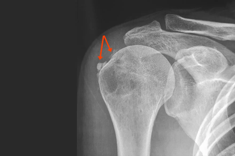 • Απλή ακτινογραφία ώμου, όπου διακρίνεται η ασβεστοποιημένη εναπόθεση